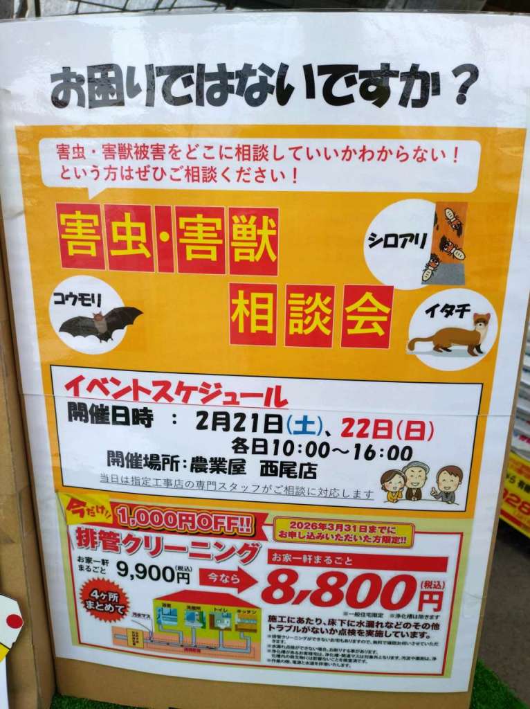 コウモリ・イタチ・シロアリなど、「これって大丈夫?」という小さな不安でもOKです。早めの相談が、被害を最小限に抑える一番の近道です。さらに今回は、排管クリーニングの特別価格キャンペーンも実施中!気になる方は、ぜひこの機会にご来店ください。相談は無料です。話を聞くだけでも大歓迎です。春を安心して迎えるために、