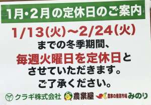 上記の通り2月末まで火曜日定休日とさせていただきます。