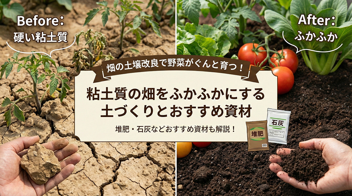 この記事では、粘土質で硬い畑をふかふかにするための土づくり(土壌改良)の基本と、堆肥・石灰・有機質資材・土壌改良材などのおすすめ資材の選び方を、家庭菜園〜小さな畑でも取り入れやすい方法に絞って解説します。